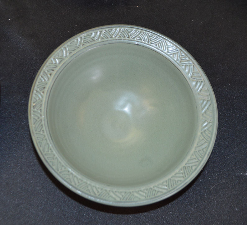 A stony greyish green with a super hard surface and a cool satin finish. Great for the inside and outside of dishes.