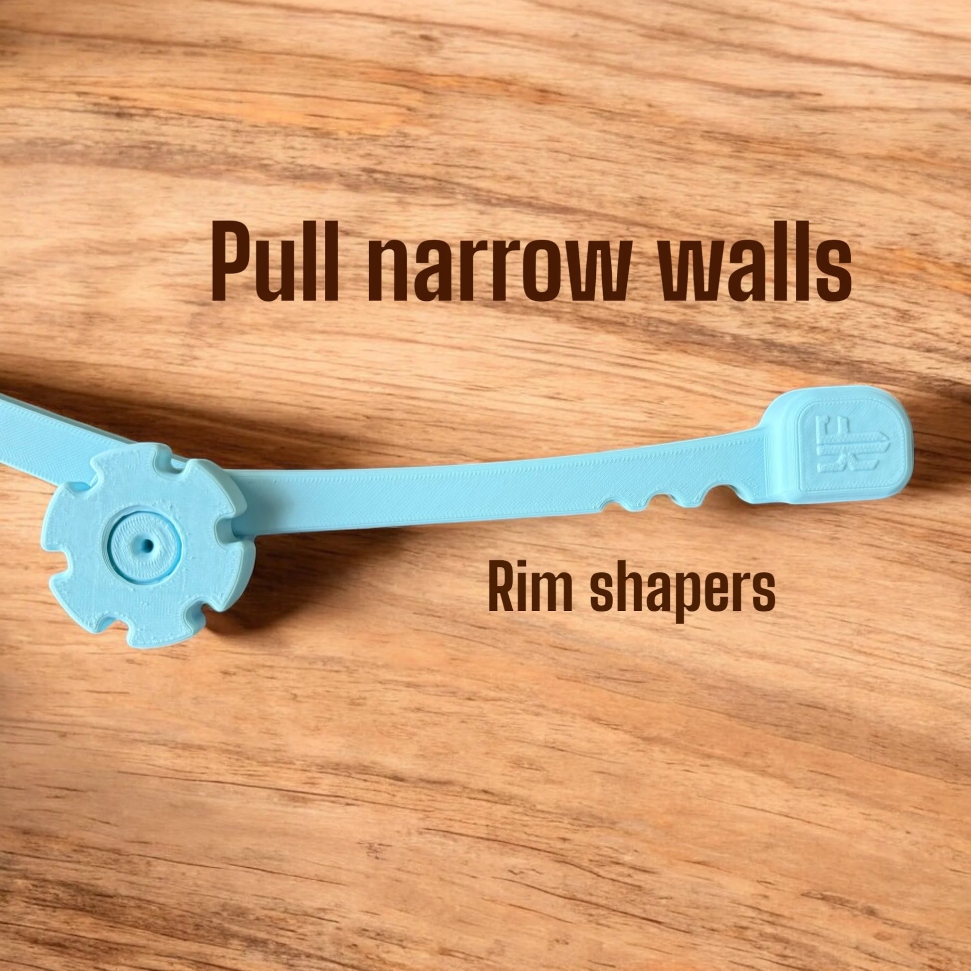 This is a real multi-tool version of an old classic. Collapsible for easy storage. The replaceable sponge allows you to keep the tool beyond when your sponge wears out and allows you the ability to customize your sponge with your favourite sponges. The opposite side is shaped to aid in pulling walls up on tall narrow cylinders where your hands wouldn’t normally fit. As a bonus - along the side are 4 rim shapers, three semi circles and one for beveled edges.